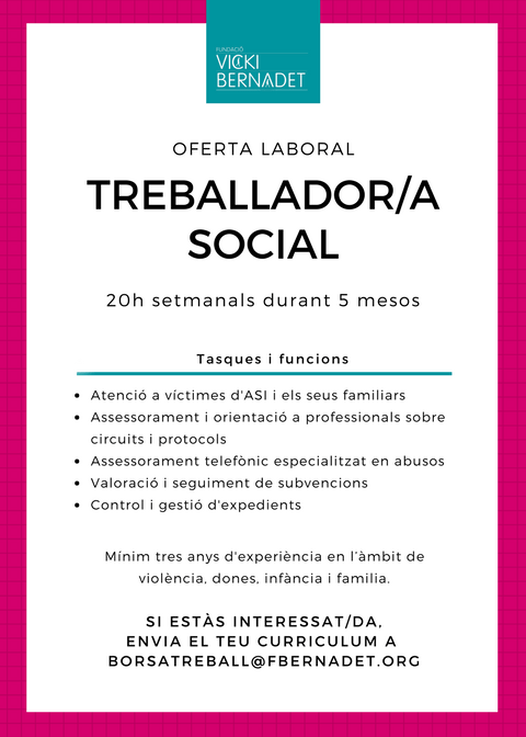 L'entitat busca un treballador/a social per incorporar-se a treballar a la seu de Barcelona. Es requereix persona major de 25 anys, amb grau de Treball Social i mínim tres anys d'experiència en l'àmbit de violència, dones, infància i família.